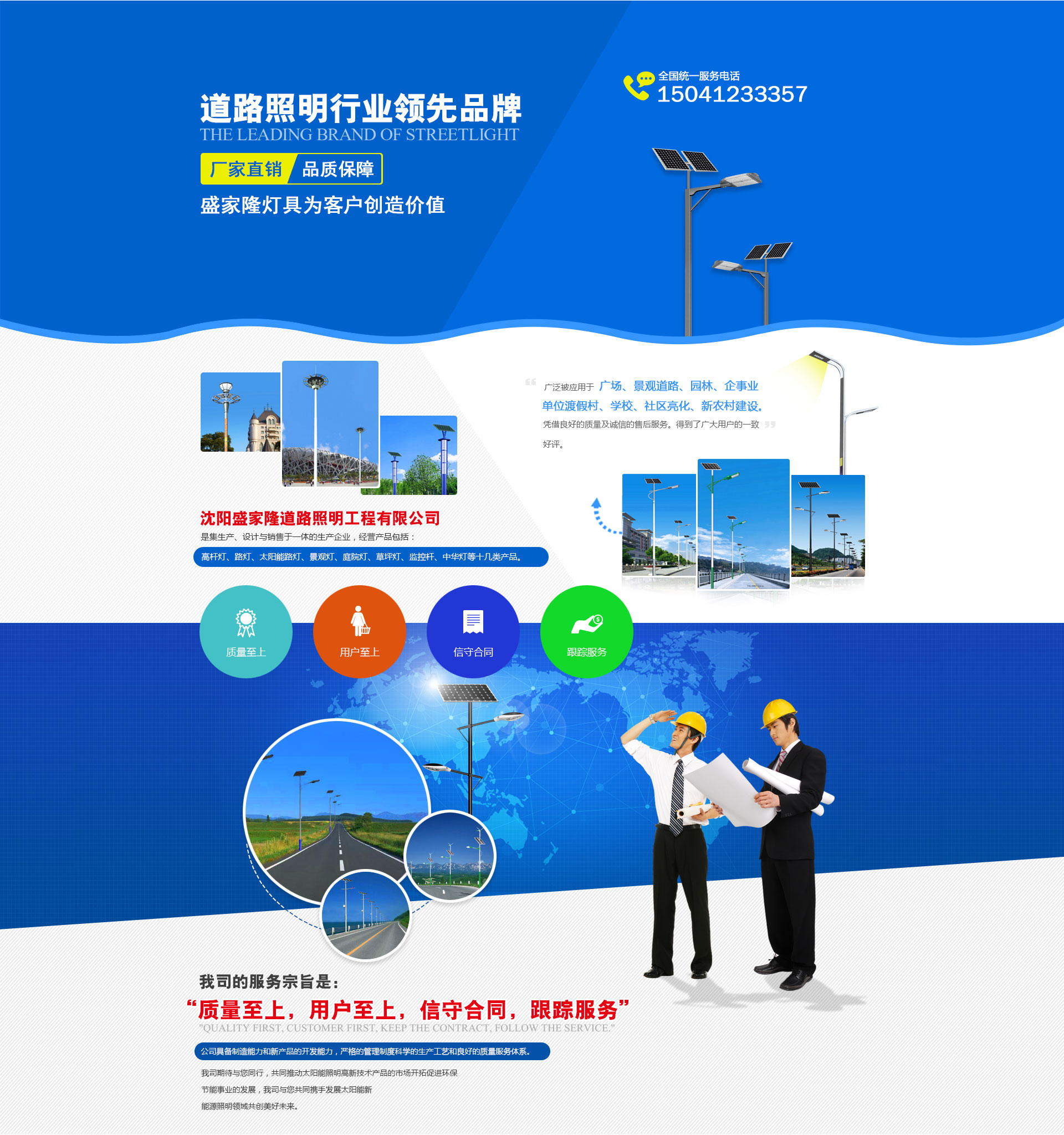 沈陽盛家隆道路照明工程有限公司坐落于沈陽市于洪區(qū)興盛村愛國,生產(chǎn)各種室外,道路,廣場(chǎng),車站,碼頭,橋梁,庭院及室內(nèi)工礦照明燈具,品種有太陽能路燈,道路燈,LED路燈,組合燈,景觀燈,庭院燈,草坪燈,彩色泛光燈,中高桿燈以及配套使用的各種路燈頭,鎮(zhèn)流器,觸發(fā)器開關(guān)箱等系列產(chǎn)品。 本公司自成立以來,已初具規(guī)模,現(xiàn)有高級(jí)技術(shù)人員5人,中級(jí)技術(shù)人員28人,研究設(shè)計(jì)人員14人,車間工人百余人,并備有大型斬彎機(jī),1600t-900t壓鑄機(jī),20t行吊,高速縱剪機(jī),埋弧自動(dòng)焊,彩色噴塑線燈先進(jìn)設(shè)備,高科技創(chuàng)造高質(zhì)量,由我公司生產(chǎn)的各種類型的照明燈具,不僅質(zhì)量可靠而且線條流暢,外形美觀,深受廣大客戶的喜愛,長期以來,我公司一直注重產(chǎn)品質(zhì)量,堅(jiān)持“質(zhì)量是企業(yè)的生命”的宗旨。由于質(zhì)量可靠,價(jià)格合理,服務(wù)周到,從而贏得了廣泛的市場(chǎng)聲譽(yù)。企業(yè)先后被評(píng)為“質(zhì)量信得過企業(yè)”“重誠信守信用企業(yè)”,“AAA級(jí)資信企業(yè)”,并通過ISO9001:2000國際質(zhì)量體系認(rèn)證,ISO14001:2004環(huán)境管理體系認(rèn)證,CCC,CQC國家強(qiáng)制性產(chǎn)品認(rèn)證和持有道路照明二級(jí)安裝,安全生產(chǎn)資質(zhì)。